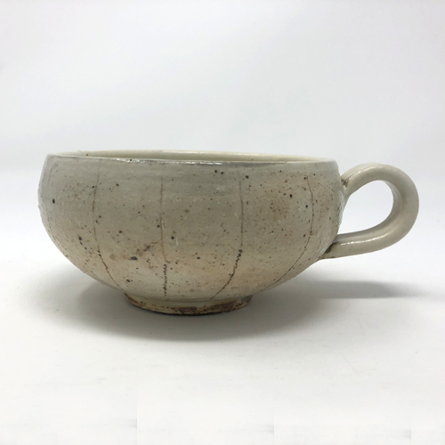 白い釉薬と縦線が特徴のスープカップ。 サイズ:幅12(取っ手含む14.5)×高さ7cm