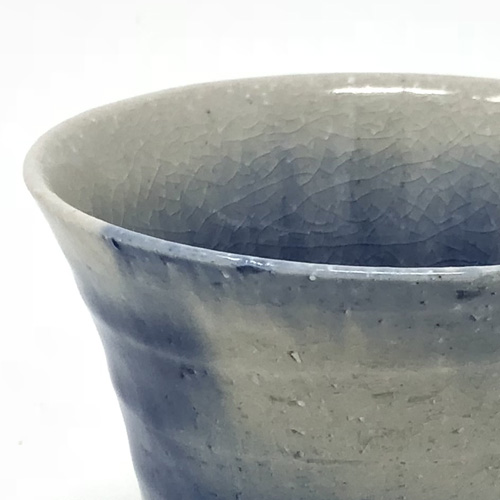 青白い釉薬と縦線が特徴のスープカップ。 サイズ:幅12(取っ手含む14.5)×高さ7cm